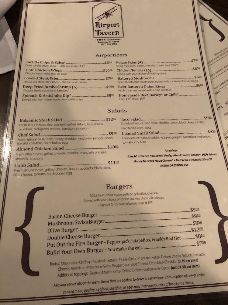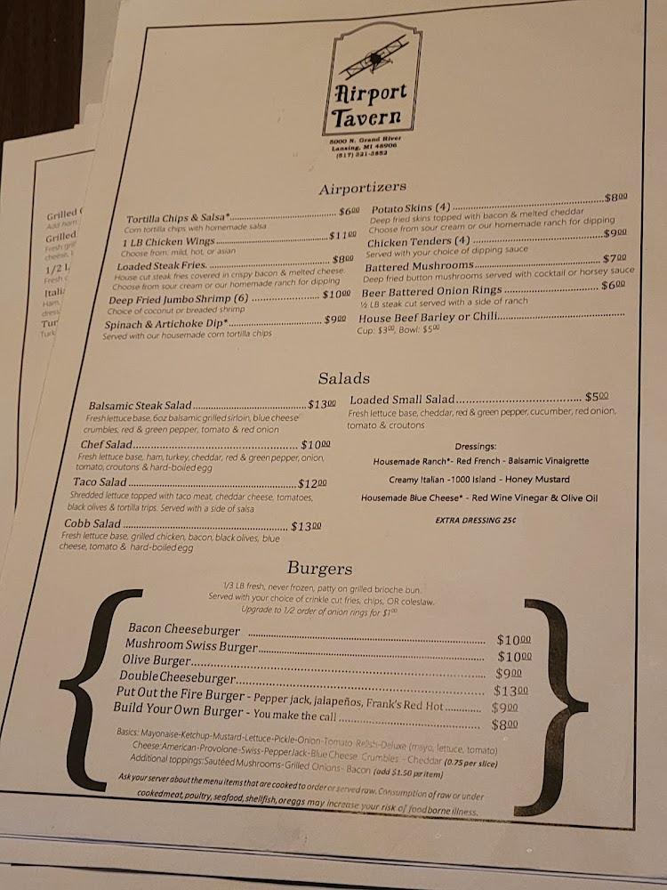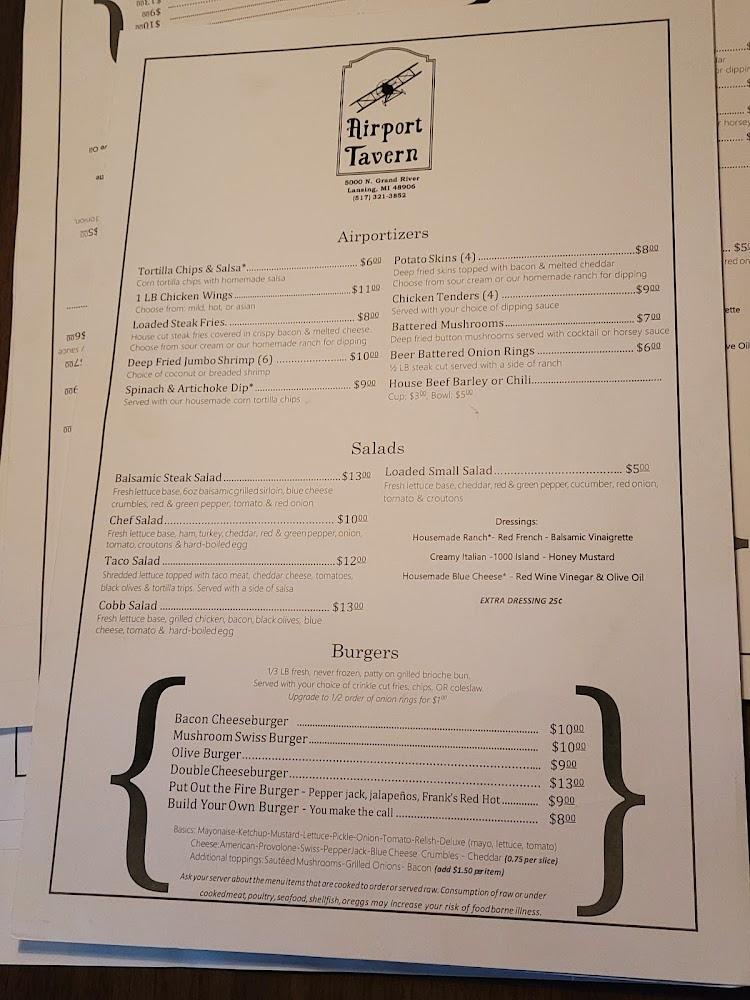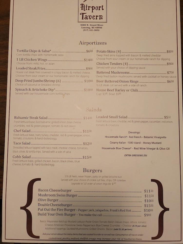 Welcome to Airport Tavern, your go-to destination in Lansing for a relaxed dining experience! Located at 5000 N Grand River Ave, we offer an extensive menu featuring American cuisine, refreshing cocktails, and a grand selection of beers. Enjoy our outdoor terrace, quick service, and sports on TV while unwinding in a friendly atmosphere. Perfect for solo diners and groups alike, we provide takeout, delivery, and accessible facilities. Don't miss our happy hour specials that elevate your dining experience without breaking the bank. Join us for great food, drinks, and good times – we can’t wait to welcome you!